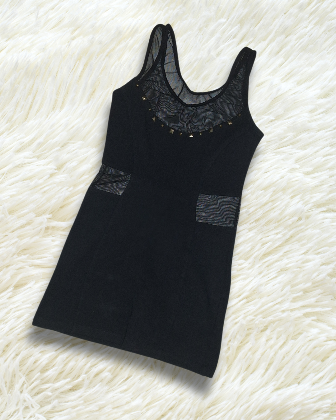 Vestido con transparencias de tul en cintura y espalda. Tachas en el escote. Talle S. Única prenda. Entrega inmediata